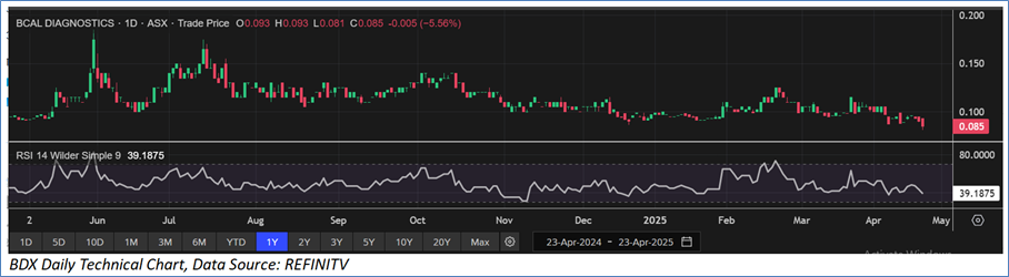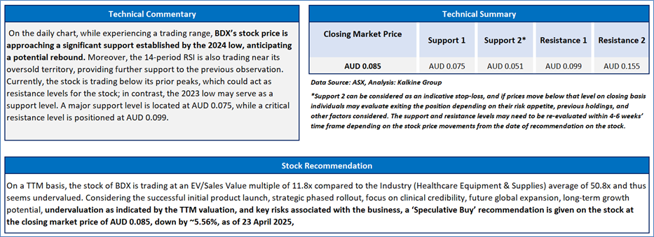 The stock has witnessed a dip of ~6.59% in the last 3 months, and over the past nine months, it has decreased by ~26.09%. The stock has a 52-week low and 52-week high of AUD 0.081 and AUD 0.185, respectively, and is currently trading below the 52-week high-low average. BDX was last covered in a report dated ‘27 March 2025’.