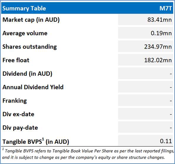 The stock has witnessed a dip of ~1.37% in last nine months, and over the last one year, it has decreased by ~39.9%. The stock has a 52-week low and 52-week high of AUD 0.280 and AUD 0.605, respectively and is currently trading below the 52-week high-low average. M7T was last covered in a report dated ’24 July 2025’.