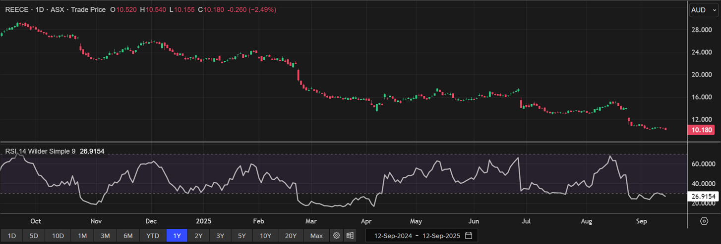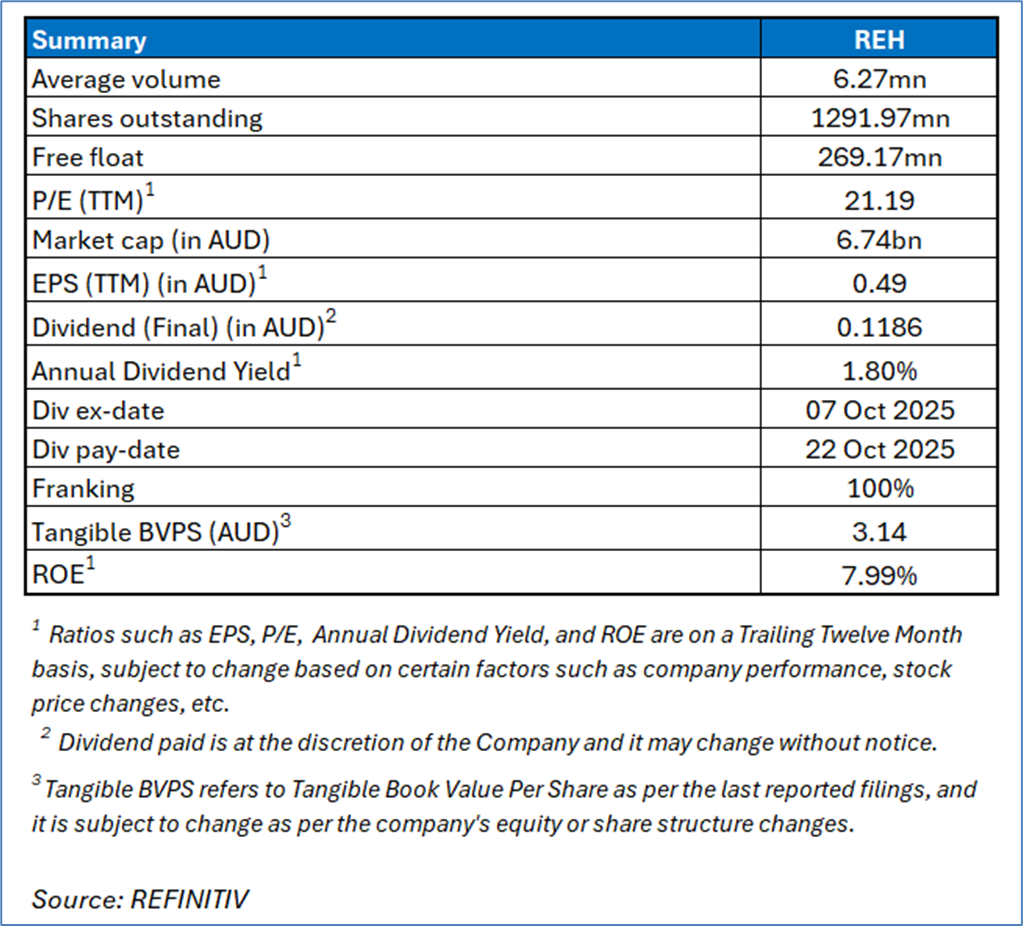 REH share price has declined by 29.11% in the past 1 month and it has corrected by around 62.81% in the last 1 year. The stock made a 52-week low and high of AUD 10.155 and AUD 29.380, respectively. REH was previously covered in a reported dated ’6 August 2025’.