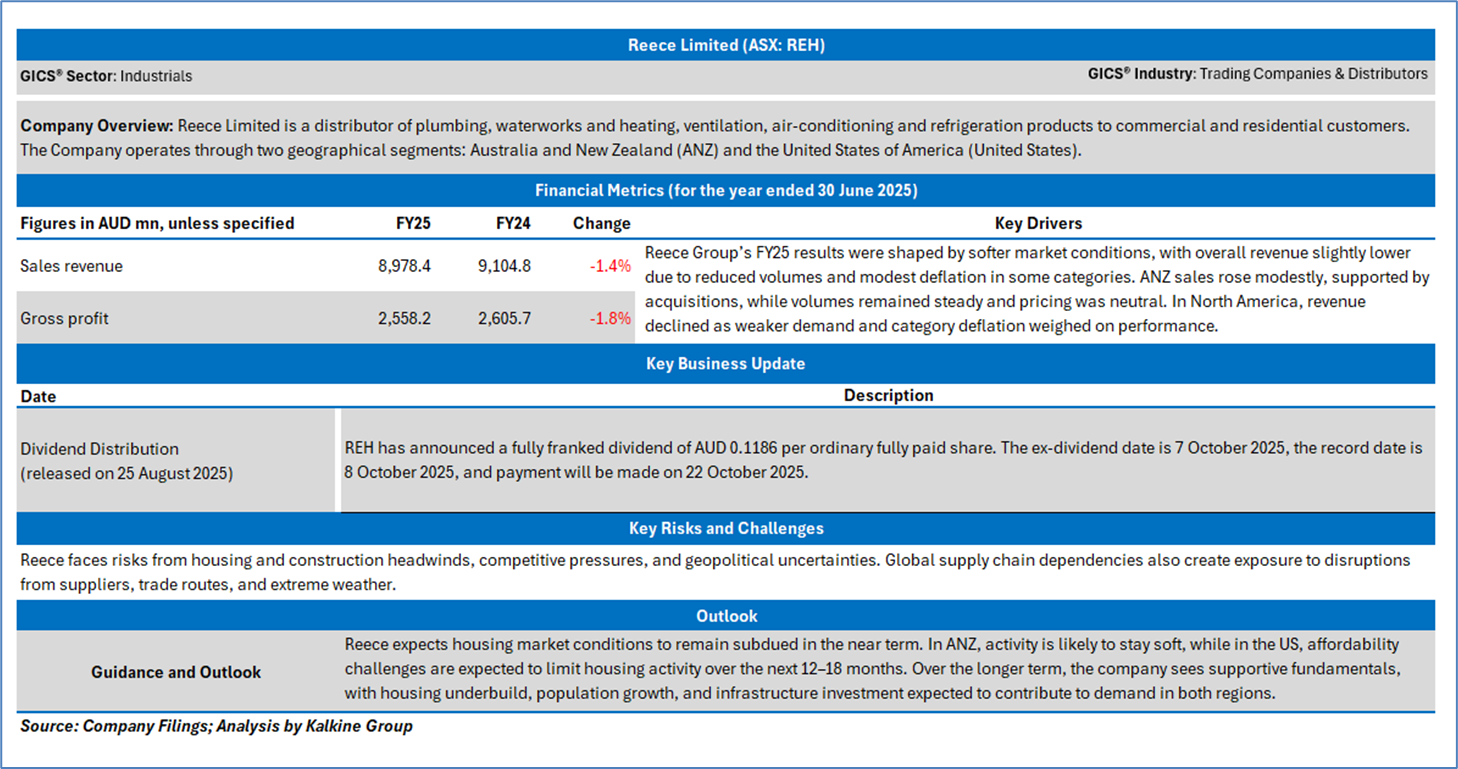 Company Overview: Reece Limited (ASX: REH) is a leading Australian distributor specializing in plumbing, waterworks, heating, ventilation, air-conditioning, and refrigeration (HVAC-R) products. It serves commercial, residential, and infrastructure customers across Australia, New Zealand, and the United States. Kalkine’s Daily Report covers the Key Financial Metrics, Risks, Outlook, Technical Analysis along with the Valuation, Target Price, and Recommendation on the stock.