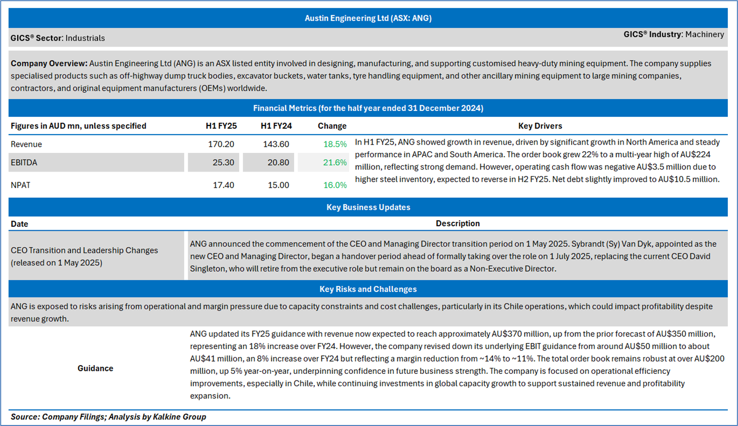 Company Overview: Austin Engineering Ltd (ANG) is an ASX listed entity involved in designing, manufacturing, and supporting customised heavy-duty mining equipment. The company supplies specialised products such as off-highway dump truck bodies, excavator buckets, water tanks, tyre handling equipment, and other ancillary mining equipment to large mining companies, contractors, and original equipment manufacturers (OEMs) worldwide. Kalkine’s Daily Report covers the Key Financial Metrics, Risks, Outlook, Technical Analysis along with the Valuation, Target Price, and Recommendation on the stock.