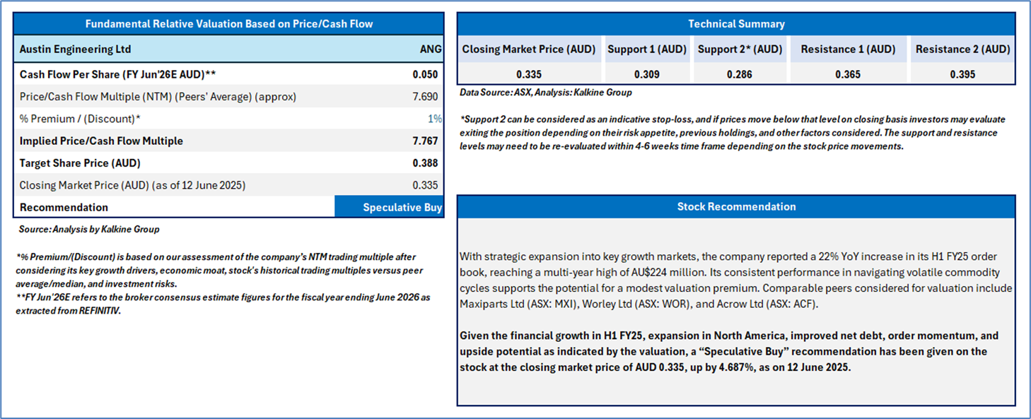 Section 2.0: Austin Engineering Ltd (ANG) (‘Speculative Buy’ at AUD 0.335, closing market price per share as on 12 June 2025)