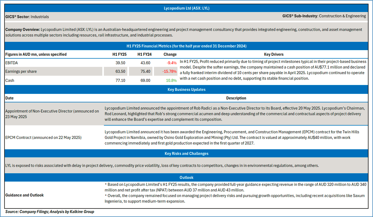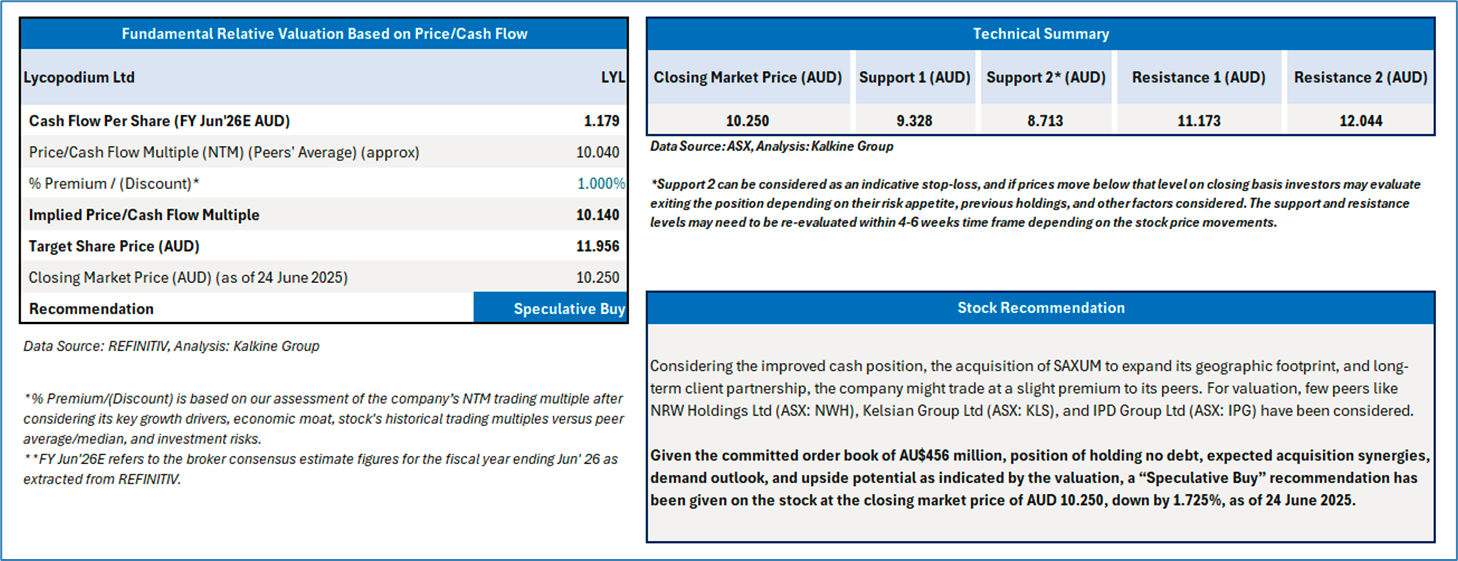 Section 2.0: Lycopodium Ltd (ASX: LYL) - (‘Speculative Buy at AUD 10.250, closing market price per share as on 24 June 2025)