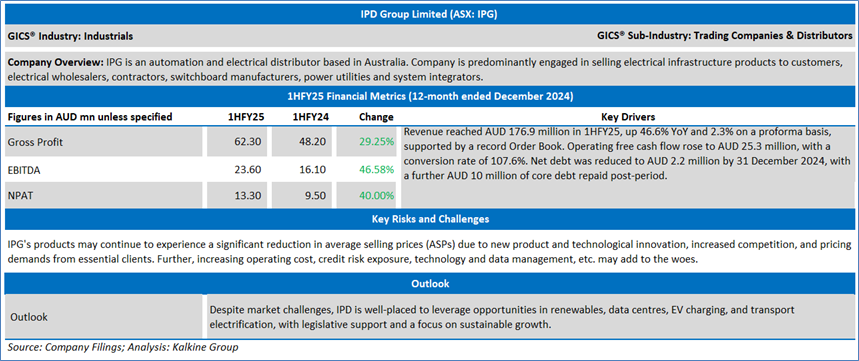 Company Overview: IPD Group Limited (ASX: IPG) is an automation and electrical distributor based in Australia. The company is predominantly engaged in selling electrical infrastructure products to customers, electrical wholesalers, contractors, switchboard manufacturers, power utilities and system integrators. Kalkine’s Daily Report covers the Key Financial Metrics, Risks, Outlook, Technical Analysis along with the Valuation, Target Price, and Recommendation on the stock.