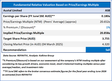 Stock might trade at a slight premium to its peers considering the expected EBIT growth in FY25, record order book, strategic expansion, new infrastructure contracts. For conducting the valuation, the following peers have been considered: DroneShield Ltd (ASX: DRO), HighCom Ltd (ASX: HCL), Johns Lyng Group Ltd (ASX: JLG), and others have been considered. Considering that the stock has surpassed its R1 level, rally in share price, current trading level, and risks associated, the share price can face consolidation at the current levels. Hence, a ‘Sell’ recommendation is given on the stock at the closing market price of AUD 4.320, as of 4 March 2025.