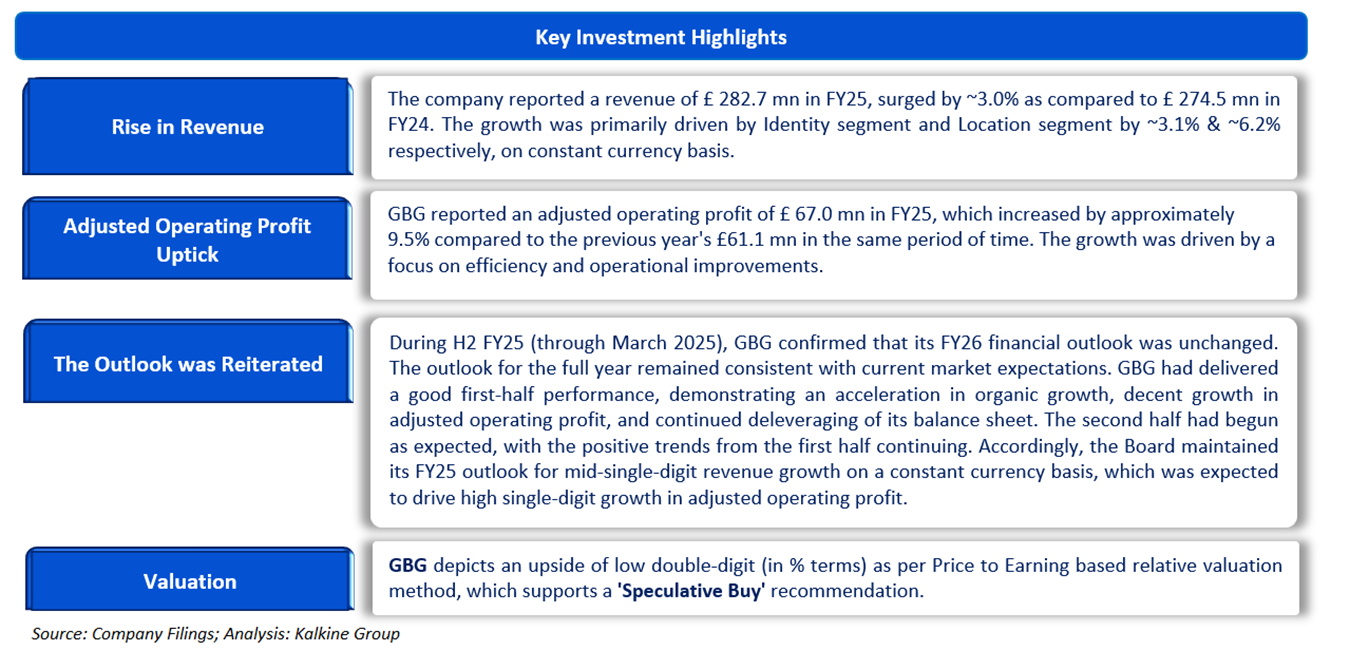 GB Group PLC (LSE: GBG) is an FTSE AIM UK 50 index company which provides identity data intelligence products and services helping organizations recognize and verify all elements of an individual's identity at key interactions in their business processes. The Company's segments include location, identity and fraud. The location segment includes address lookup, verification and capture; e-mail validation; phone verification, and data maintenance services. The identity segment includes document verification, data verification and identity investigation services. Its identity verification solutions can be configured to carry out a wide range of functions, including know your customer checks, anti-money laundering checks, age verification checks and liveness detection. The fraud segment includes transaction fraud monitoring, combating origination fraud and in-life fraud investigation services. It provides artificial intelligence powered screening for automatic onboarding or referrals of customers.