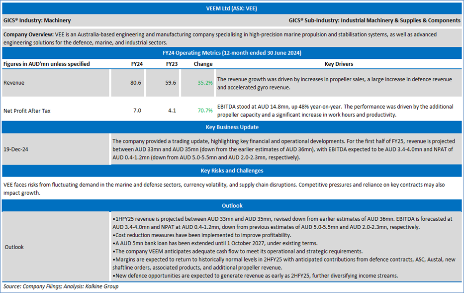 Company Overview: VEEM Ltd (ASX: VEE) is an Australian-based engineering and manufacturing company specialising in high-precision marine propulsion and stabilisation systems, as well as advanced engineering solutions for the defence, marine, and industrial sectors. Kalkine’s Daily Report covers the Key Financial Metrics, Risks, Outlook, Technical Analysis along with the Valuation, Target Price, and Recommendation on the stock.
