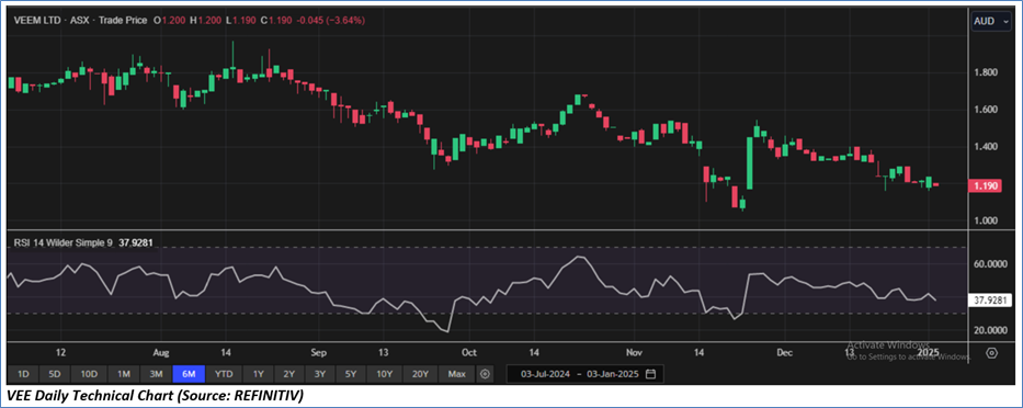 The stock has declined by ~16.78% in the last one month, and over the last one year, it has moved up by ~10.19%. The stock has a 52-week low and 52-week high of AUD 0.995 and AUD 2.020, respectively and is currently trading near the 52-week-low level. VEE was last covered in a report dated ‘19 December 2024’.