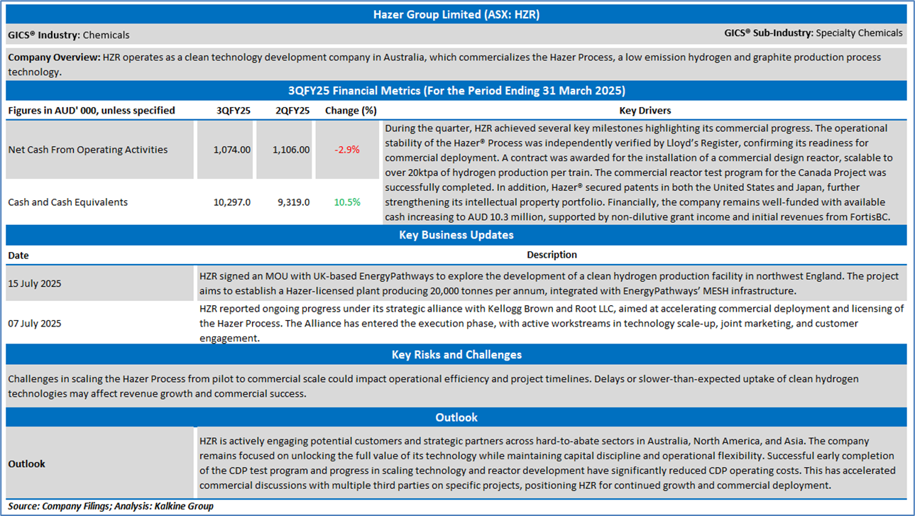Company Overview: Hazer Group Limited (ASX: HZR) operates as a clean technology development company in Australia, which commercializes the Hazer Process, a low emission hydrogen and graphite production process technology. Kalkine’s Daily Report covers the Key Financial Metrics, Risks, Outlook, and Technical Analysis along with the Valuation, Target Price, and Recommendation on the stock.