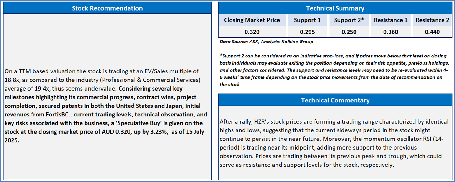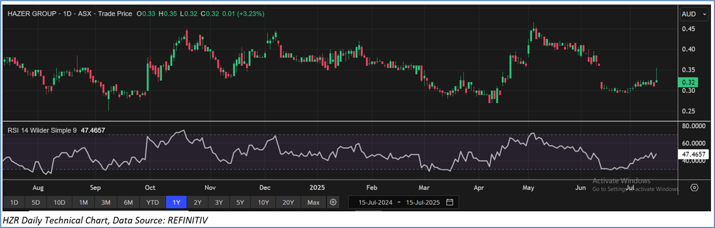 Section 2.0: Hazer Group Limited (‘Speculative Buy’ at AUD 0.320, closing market price per share as on 15 July 2025)