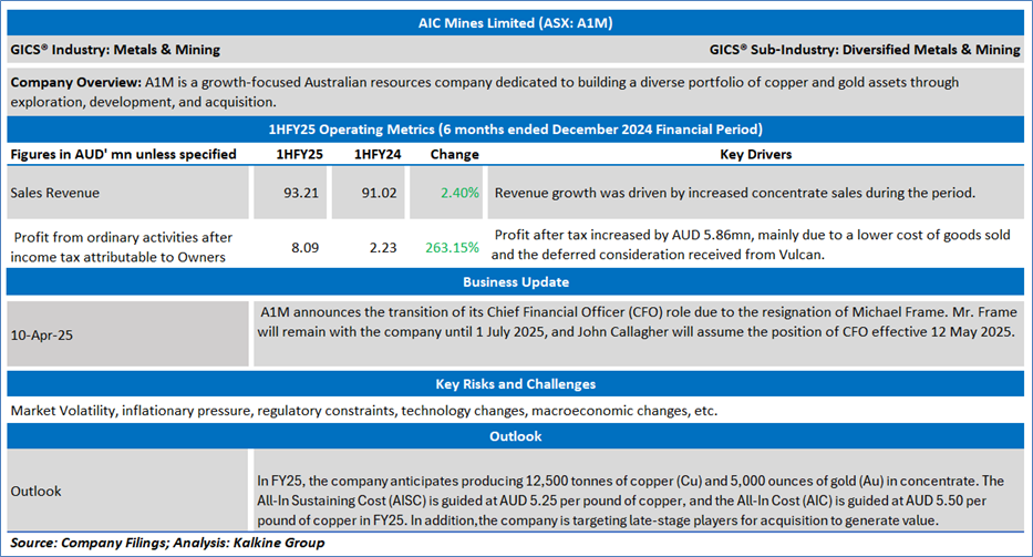 Company Overview: AIC Mines Limited (ASX: A1M) is a growth-focused Australian resources company dedicated to building a diverse portfolio of copper and gold assets through exploration, development, and acquisition. Kalkine’s Daily Report covers the Key Financial Metrics, Risks, Outlook, and Technical Analysis along with the Valuation, Target Price, and Recommendation on the stock.