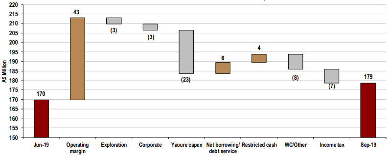 Key Highlights of September’19 Quarter:Gold production for the quarter stood at 65,825 ounces with All-In Site Cost (AISC) of US$922/ounce. Gold sales for the quarter stood at 73,561 ounces, with an average sales price of US$1,374/ounce. Notional cashflow for the quarter stood at US$29.8 Mn. The improvement in gold production and reduction in AISC for the period can be attributed to operational efficiency achieved at both of the company’s sites Edikan and Sissingué.