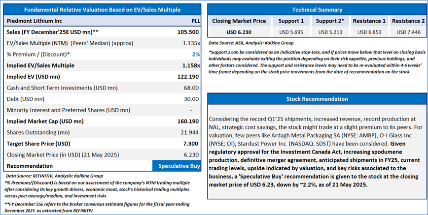 Section 2.0: Piedmont Lithium Inc. (‘Speculative Buy’ at USD 6.230, closing market price per share as on 21 May 2025)