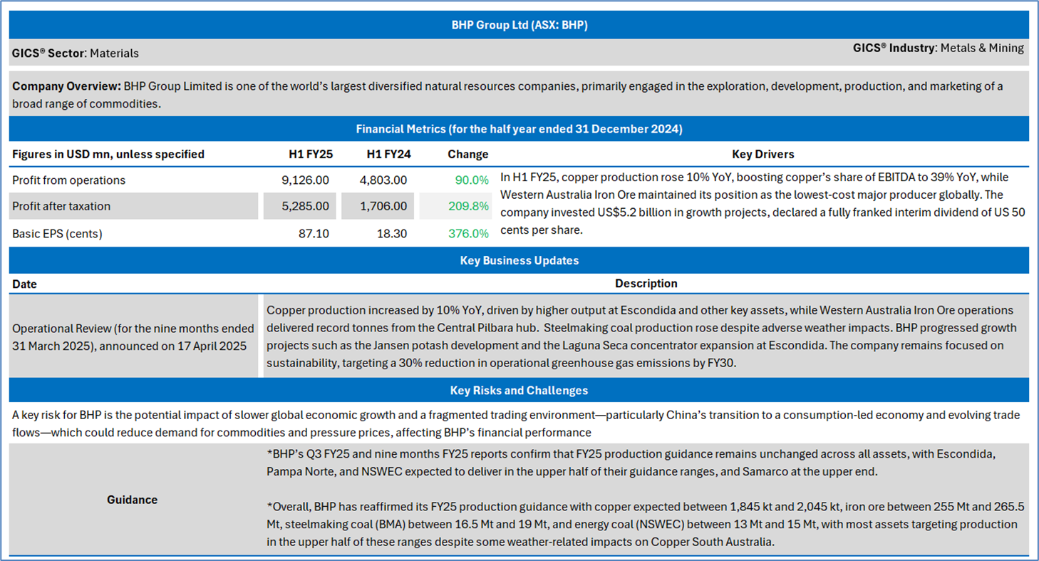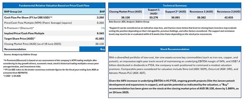 Section 2.0: BHP Group Ltd (ASX: BHP) - (‘BUY’ at AUD 36.130, closing market price per share as on 19 June 2025)