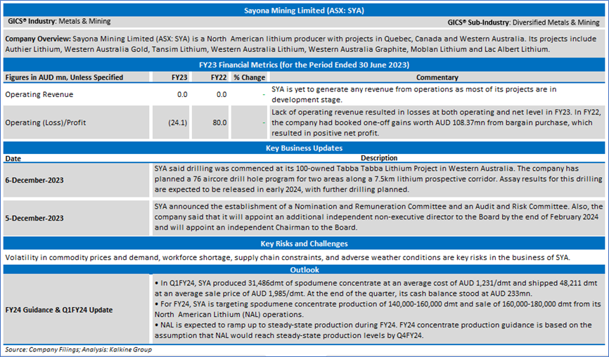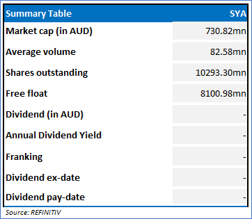 The stock has witnessed a decline of ~63.16% in 6 months and over the last 9 months, it has fallen by ~64.10%. The stock has a 52-week low and 52-week high of AUD 0.051 and AUD 0.300, respectively and is currently trading below the average of 52-week high-low average. SYA was last covered in a report dated ‘14 November 2023’.