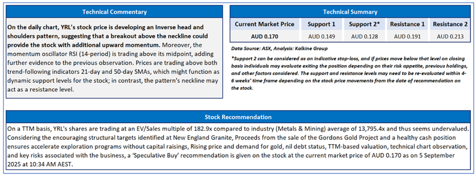 As per the previous recommendation on YRL on 05 September 2025, a ‘Speculative Buy’ rating was given on the stock at AUD 0.170, and noted below are the details of support and resistance provided in the previous report: