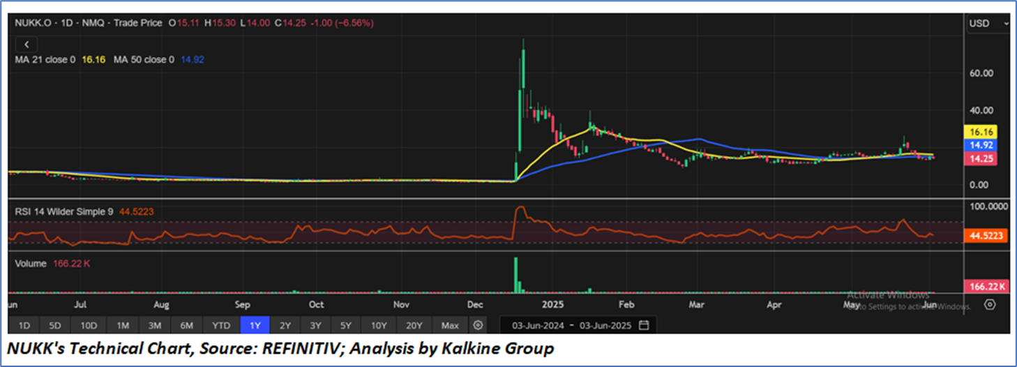 NUKK has been consolidating between USD 12 and USD 18 since its sharp spike and subsequent decline in late December 2024. The stock is currently trading below both its 21-day and 50-day moving averages, signaling short-term bearish momentum. RSI sits at a neutral 44.5, indicating no overbought or oversold conditions, while low trading volume suggests waning investor interest.