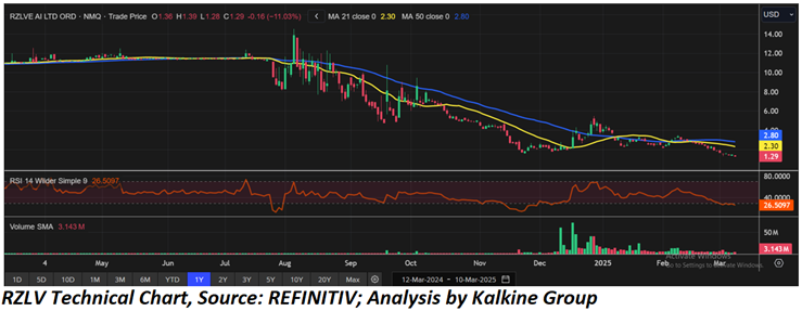 RZLV is in a strong downtrend, trading below both its 21-day (USD 2.30) and 50-day (USD 2.80) moving averages, confirming bearish momentum. The RSI at 26.50 indicates oversold conditions, suggesting a potential short-term bounce. Key support is around USD 1.29, with resistance at USD 2.30 and USD 2.80. Volume remains low, signaling weak buying interest. A break above the 50-day MA could indicate a trend reversal, while a drop below USD 1.29 may lead to further downside..