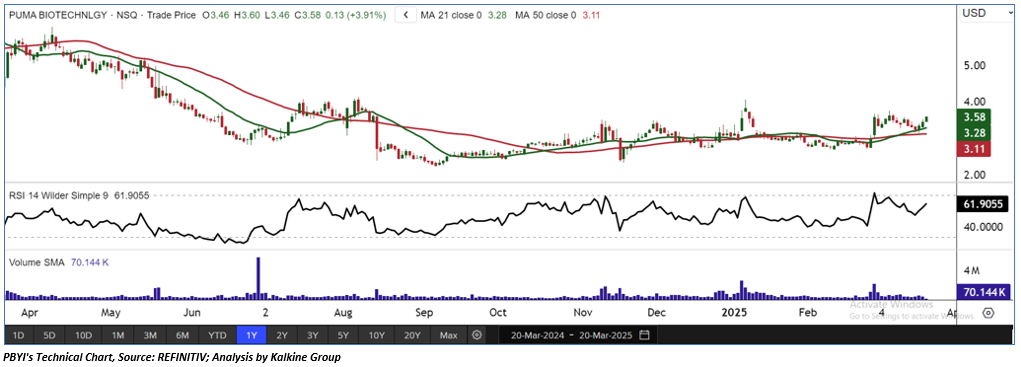 Puma Biotechnology Inc (NASDAQ: PBYI) is a biopharmaceutical company dedicated to developing and commercializing innovative products aimed at improving cancer treatment. Its flagship product, NERLYNX, is an oral formulation of neratinib designed for the treatment of HER2-positive breast cancer. As per our previous US Dailies report published on ‘PBYI’ on 27th Dec 2024, Kalkine provided an ‘Speculative Buy’ stance on the stock at USD 3.15 based on fundamental analysis and the stock price has now moved by ~ 13.65% since then and is trading above resistance 1.
