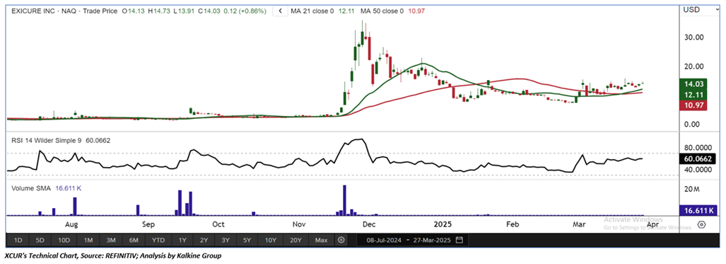 Exicure, Inc. (NASDAQ: XCUR) is an early-stage biotechnology company focused on developing nucleic acid therapies targeting ribonucleic acid against validated targets. As per our previous US Dailies report published on ‘XCUR’ on 4th March 2025, Kalkine provided an ‘Speculative Buy’ stance on the stock at USD 14.03 based on fundamental analysis and the stock price has now moved by ~ 23.93% since then and is trading above resistance 2.