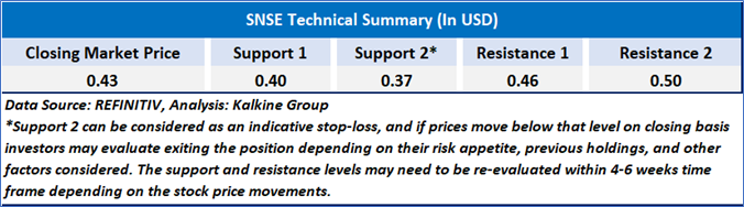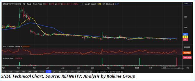 The stock has been in a prolonged downtrend since mid-2024, currently trading sideways with low volatility below USD 0.50. The 21-day and 50-day moving averages indicate weak momentum, while RSI at 42.89 suggesting bears are heavy over bulls. Volume remains low, except for a recent spike, hinting at possible accumulation. A breakout above USD 0.50 could trigger bullish momentum, while a drop below USD 0.40 may lead to further declines. The stock remains in consolidation, awaiting a strong catalyst for direction.
