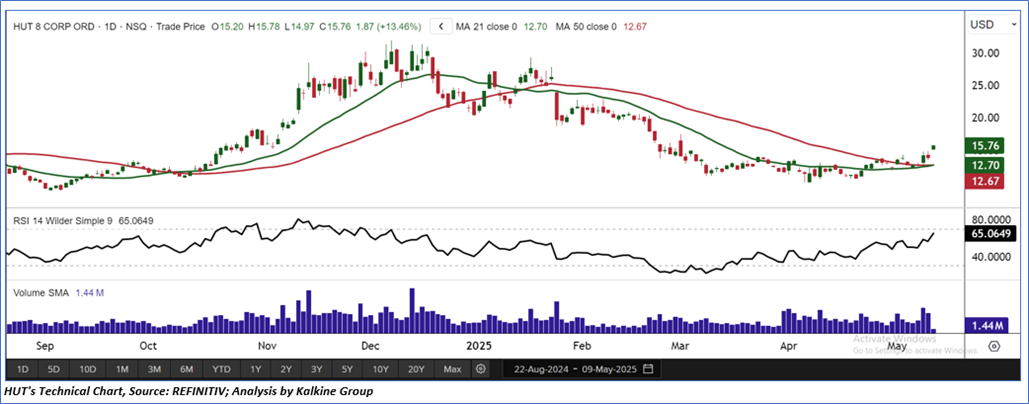 Hut 8 Corp. (NASDAQ: HUT) is a data mining company. The Company is a vertically integrated operator of large-scale energy infrastructure and bitcoin miner. The Company acquires, designs, builds, manages, and operates data centers that power compute-intensive workloads. As per our previous US Dailies report published on ‘HUT’ on 8th May 2025, Kalkine provided an ‘Speculative Buy’ stance on the stock at USD 13.40 based on technical analysis and the stock price has now moved up by ~17.61% since then and trading above resistance 1 .