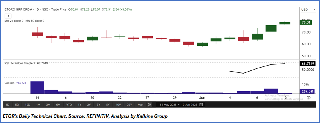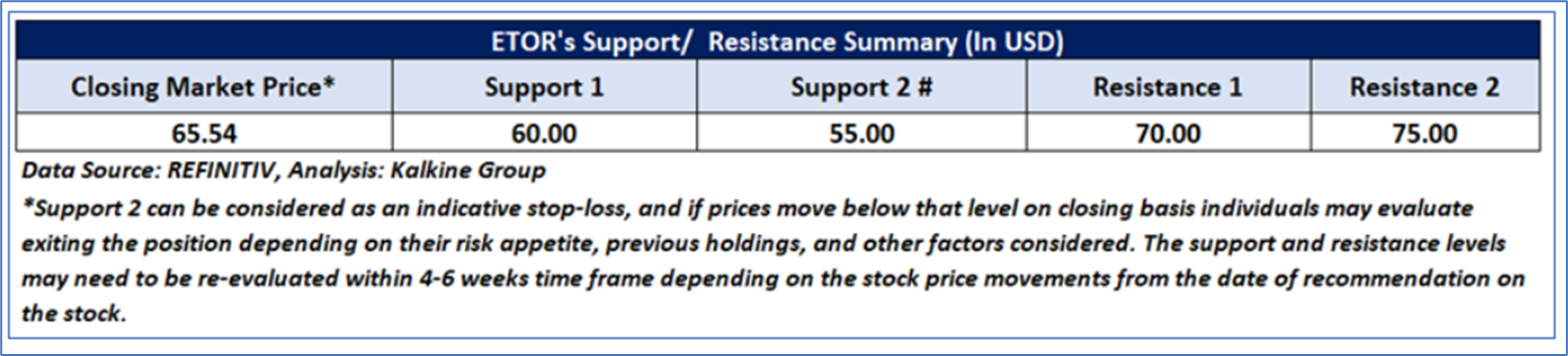 As per our previous US Diversified Opportunities Report published on ‘ETOR’ on 22nd May, 2025, Kalkine provided an ‘Buy’ stance on the stock at USD 65.54 based on fundamental analysis and the stock price has now moved by ~ 19.48% since then and is trading above resistance 2.