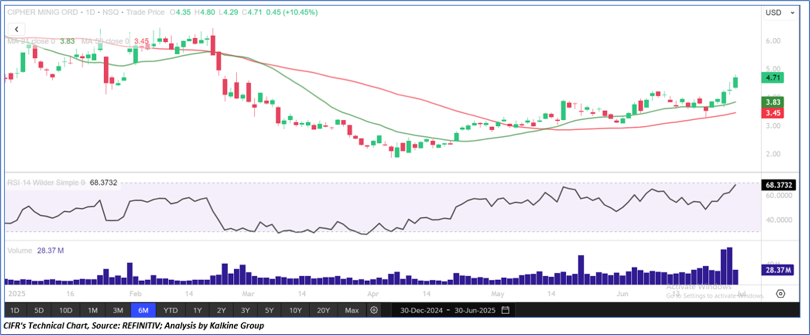 Cipher Mining Inc. (NASDAQ: CIFR) is a technology company focused on the development and operation of bitcoin mining data centers. As per our previous US Dailies report published on ‘CIFR’ on 20th May 2025, Kalkine provided a ‘Speculative Buy’ stance on the stock at USD 3.68 based on technical analysis and the stock price has now moved up by ~27.99% and trading above resistance 2.