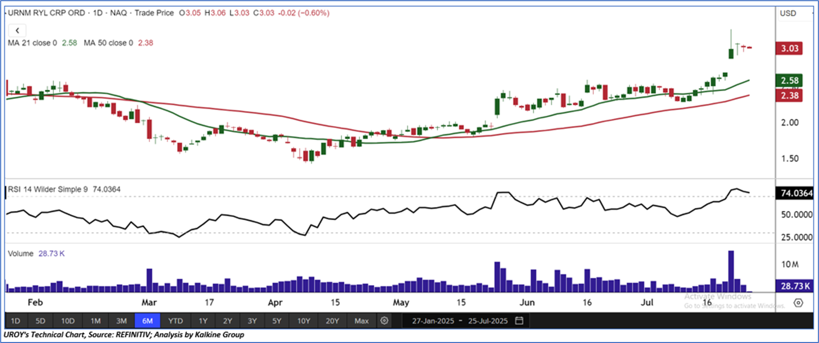 Uranium Royalty Corp (NASDAQ: UROY) is a company dedicated to the uranium sector, aiming to benefit from movements in uranium prices by strategically investing in various uranium-related assets. As per our previous US Daily Report published on ‘UROY’ on 27th May 2025, Kalkine provided a ‘Speculative Buy’ stance on the stock at USD 2.33 based on fundamental analysis and the stock price has now moved up by ~30.04% and trading above resistance 2.