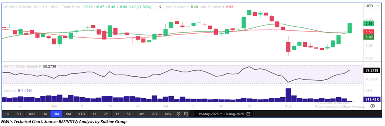 Newell Brands Inc (NASDAQ: NWL) is a worldwide consumer products company that operates through three main business segments: Home and Commercial Solutions, Learning and Development, and Outdoor and Recreation. As per our previous US dailies report published on ‘NWL’ on 4th Aug 2025, Kalkine provided a ‘Buy’ stance on the stock at USD 4.76 based on fundamental analysis and the stock price has now moved up by 23.10% and trading near above 2.