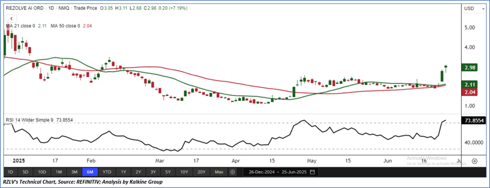 Rezolve AI PLC (NASDAQ: RZLV) is a United Kingdom-based pure-play artificial intelligence (AI) company, featuring a proprietary Large Language Model (LLM) specifically designed for the retail sector. As per our previous US Dailies report published on ‘RZLV’ on 16th May 2025, Kalkine provided a ‘Speculative Buy’ stance on the stock at USD 2.29 based on technical analysis and the stock price has now moved up by ~30.13% and trading above resistance 2.