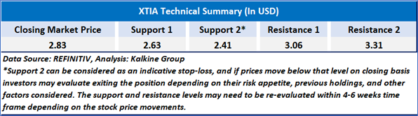 XTIA remains in a strong downtrend, trading at USD 2.83, well below its 21-day (USD 3.26) and 50-day (USD 5.74) moving averages. The RSI at 36.87 signals weak momentum, though nearing oversold levels. Volume remains low, except for a brief spike in December-January. The stock faces resistance at USD 3.06 and USD 3.31, with key support around USD 2.41. While a short-term bounce is possible if it becomes oversold, the overall trend remains bearish unless sustained buying pressure emerges.