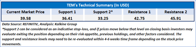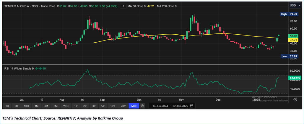 As per our previous US American Technology Report published on ‘TEM’ on 07th January 2025, Kalkine provided a ‘Buy’ stance on the stock at USD 39.58 based on “decent fundamentals, other key financial highlights, the upside indicated by valuation and key risks” and the stock price has now moved by ~26.33% since then and attained resistance 1 and resistance 2.