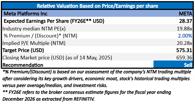 Considering the current trading levels, volatile macro environment, lower intrinsic value as per P/E relative valuation, tariffs uncertainties, resistance 1 attainment, and risks associated, a ‘Sell’ rating is assigned to the “META” at the closing market price of USD 659.36, as of May 14, 2025.