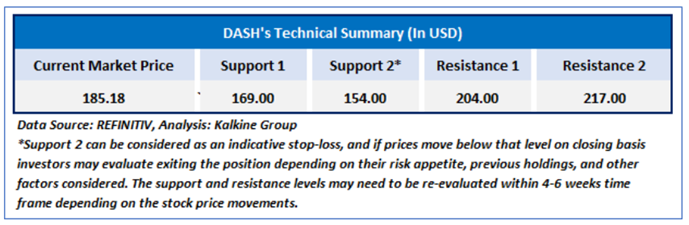 As per our previous US Dailies Report published on ‘DASH’ on 12th March, 2025, Kalkine provided an ‘Buy’ stance on the stock at USD 185.18 based on technical analysis and the stock price has now moved by ~ 11.34% since then and is trading above resistance 1.