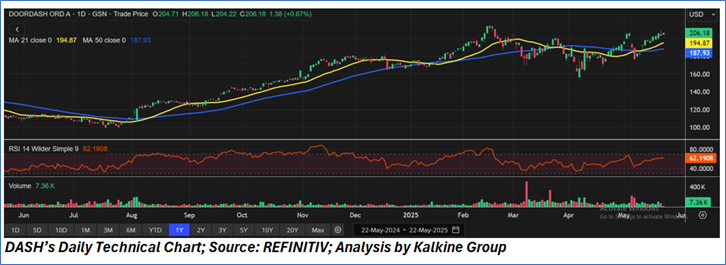 Considering the target level attainments and increasing volatility over global equity market, a ‘Sell’ rating is assigned to the ‘DASH’ at the current market price of USD 206.18 as of 22 May, 2025 at 07:15 AM PDT.