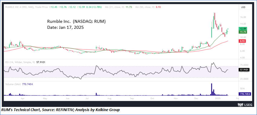 Rumble Inc. (NASDAQ: RUM) is a video sharing platform and cloud services provider. The Company comprises two segments: Rumble Services and Rumble Cloud. Rumble Services consists of three core businesses: Rumble Video, Rumble Studio, and Rumble Advertising Center (RAC). As per our previous US Dailies report published on ‘RUM’ on 14th Jan 2025, Kalkine provided an ‘Buy’ stance on the stock at USD 10.92 based on technical analysis and the stock price has now moved by ~ 13.26% since then and is trading above resistance 1.