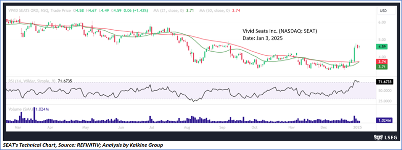 Vivid Seats Inc. (NASDAQ: SEAT) is an online ticket marketplace that utilizes its technology platform to connect fans of live events with ticket sellers. Its segments include Marketplace and Resale. As per our previous US Dailies report published on ‘SEAT’ on 18th Dec 2024, Kalkine provided an ‘Speculative Buy’ stance on the stock at USD 3.58 based on technical analysis and the stock price has now moved by ~28.21% since then and is trading above target 2.