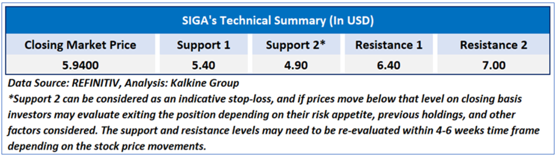 As per our previous US Dailies Report published on ‘SIGA’ on 14th May, 2025, Kalkine provided an ‘Speculative Buy’ stance on the stock at USD 5.94 based on fundamental analysis and the stock price has now moved by ~ 5.05% since then and is hovering around resistance 1.