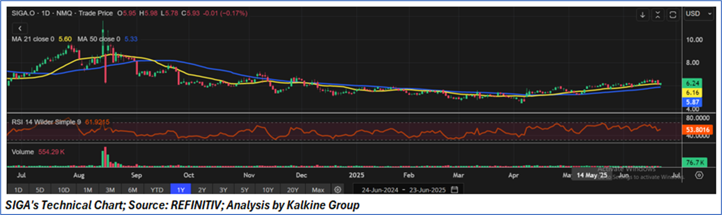 Considering a sharp year-over-year revenue decline, recorded net loss for Q1 2025, and heavy reliance on delayed government procurement deliveries, signaling weak near-term financial performance and dependency risk, a ‘Sell’ rating is assigned to the ‘SIGA’ at the current market price of USD 6.24 as of 23 June 2025 at 08:05 AM PDT.