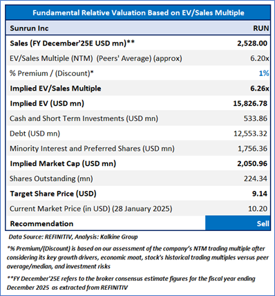 RUN is expected to trade at premium based on cash generation guidance for FY25, expected storage capacity installations in FY25, expected solar energy capacity installations in FY25, and forecasted growth in net subscriber value. For conducting the valuation, the following peers have been considered: NeoVolta Inc (NASDAQ: NEOV), Eos Energy Enterprises Inc (NASDAQ: EOSE), Amprius Technologies Inc (NYSE: AMPX), and others have been considered.