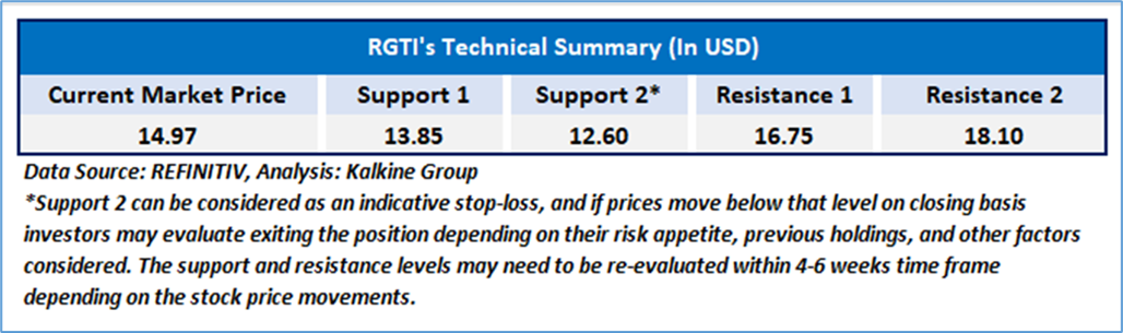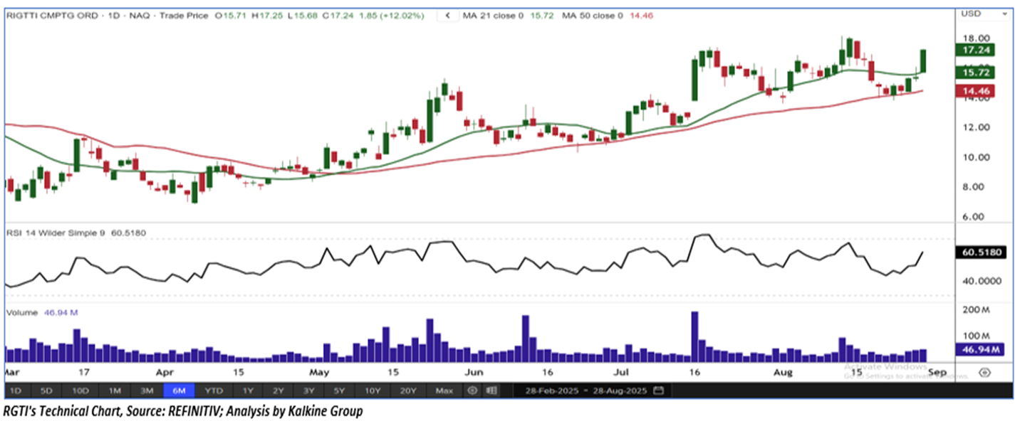 Rigetti Computing, Inc. (NASDAQ: RGTI) is a full-stack quantum computing company. The Company operates quantum computers over the cloud and serves global enterprise, government, and research clients through its Rigetti Quantum Cloud Services platform. As per our previous US Daily Report published on ‘RGTI’ on 26th Aug 2025, Kalkine provided a ‘Speculative Buy’ stance on the stock at USD 14.97 based on technical analysis and the stock price has now moved up by 15.16% and trading near resistance 2.