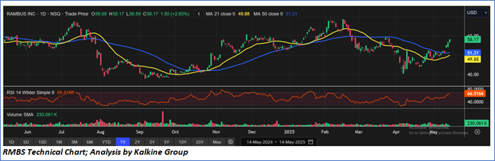 Based on the notional gains, valuation downside and price action stance, a "Sell" recommendation on Rambus Inc. (NASDAQ: RMBS) has been given at the current market price of USD 58.17 as on 14 May 2025 at 08:45 AM PDT.