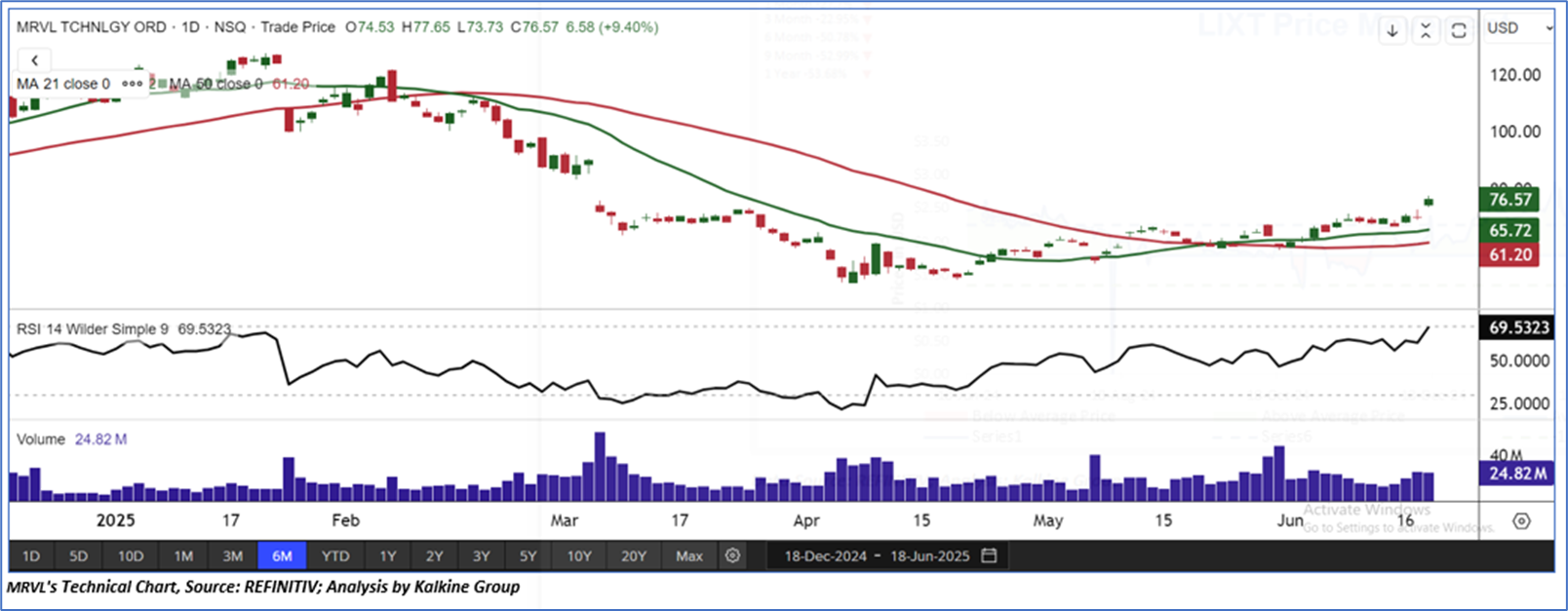 Marvell Technology, Inc. (NASDAQ: MRVL) along with its subsidiaries, provides semiconductor solutions for data infrastructure, supporting everything from core data centers to the network edge. As per our previous US Dailies report published on ‘MRVL’ on 28th May 2025, Kalkine provided a ‘Buy’ stance on the stock at USD 63.82 based on fundamental analysis and the stock price has now moved up by ~19.97% and trading above resistance 2.