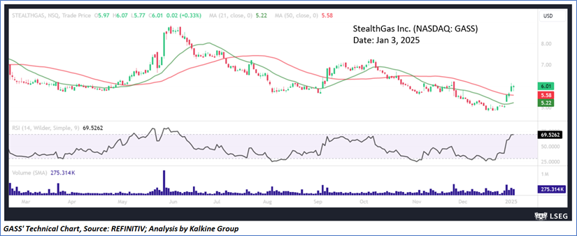 StealthGas Inc. (NASDAQ: GASS) is a provider of international seaborne transportation services to liquefied petroleum gas (LPG) producers and users, as well as crude oil and product carriers to oil producers, refineries and commodities traders. As per our previous US Dailies report published on ‘GASS’ on 6th Dec 2024, Kalkine provided an ‘Speculative Buy’ stance on the stock at USD 5.13 based on technical analysis and the stock price has now moved by ~17.15% since then and is trading above target 1.