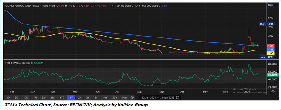 The Relative Strength Index (RSI) over a 14-day period stands at a value of 52.50, with expectations of a consolidation or upward momentum if the important support levels of USD 1.80-USD 1.90 hold. Additionally, the stock's current positioning is above both the 50-period SMA and 200-period SMA, which may serve as dynamic short to medium-term support levels.