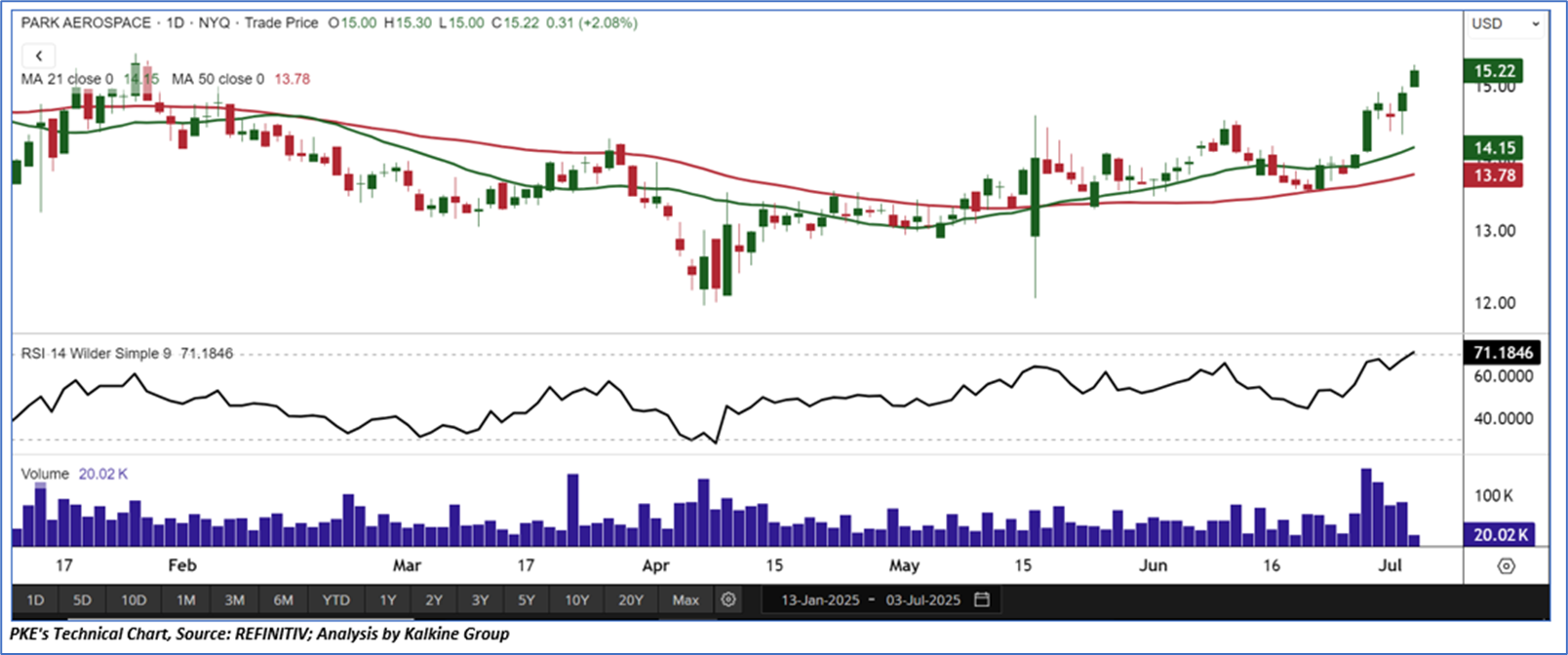 Park Aerospace Corp (NYSE: PKE) designs and produces advanced composite materials, including solution and hot-melt composites, which are used in manufacturing composite structures for the worldwide aerospace industry. As per our previous US Dailies report published on ‘PKE’ on 23rd June 2025, Kalkine provided a ‘Buy’ stance on the stock at USD 13.58 based on fundamental analysis and the stock price has now moved up by ~12.07% and trading below resistance 2.