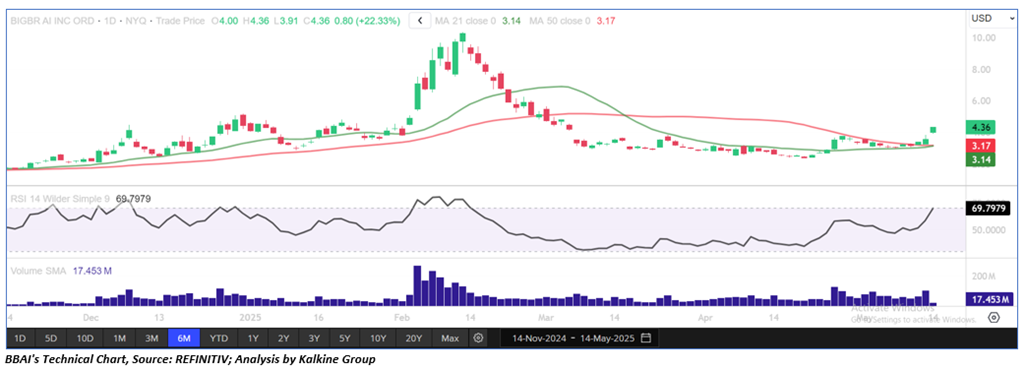 BigBear.ai Holdings, Inc. (NYSE: BBAI) is a provider of artificial intelligence (AI)-powered decision intelligence solutions for national security, supply chain management and digital identity. As per our previous US Dailies report published on ‘BBAI’ on 13th May 2025, Kalkine provided an ‘Speculative Buy’ stance on the stock at USD 3.35 based on technical analysis and the stock price has now moved up by ~30.15% and trading above resistance 2.