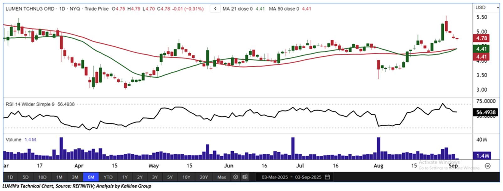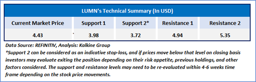 Lumen Technologies, Inc. (NYSE: LUMN) is a networking company, which connects people, data, and applications quickly and securely. The Company is engaged in providing an array of integrated products and services to its domestic and global business customers and its domestic mass market customers. As per our previous US Daily Report published on ‘LUMN’ on 27th June 2025, Kalkine provided a ‘Speculative Buy’ stance on the stock at USD 4.43 based on technical analysis and the stock price has now moved up by 7.90% and trading near resistance 1.