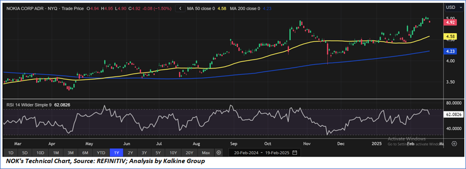 The Relative Strength Index (RSI) over a 14-day period stands at a value of 62.08, currently upward trending nearing an important resistance of USD 5.00, with expectations of a consolidation or upward momentum once this USD 5.00 is broken on the upside. Additionally, the stock's current positioning is above both the 50-period SMA and 200-period SMA, which may serve as dynamic short to medium-term support levels.